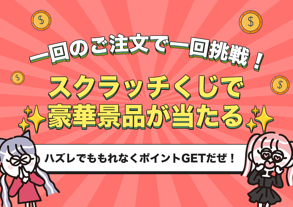一回のご注文で一回挑戦! スクラッチくじで豪華景品が当たる! ※ハズレでももれなくポイントGETだぜ! お買い物のあとに、ちょ...